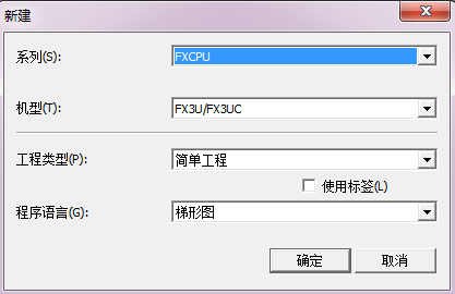 打开软件,首先点击【工程】,【新建】,在途中设置:①系列:FXCPU;②机型:FX3U/FX3NC,按确定,