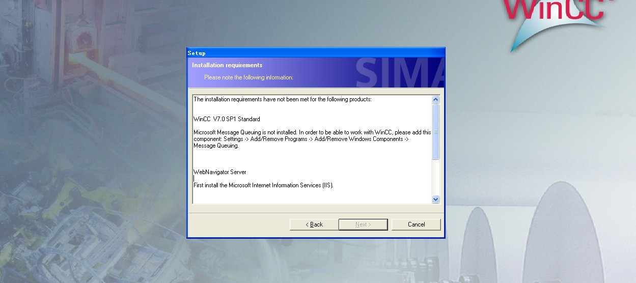 Microsoft Message Queuing is not installed. In order to be able to work with WinCC, please add this component: Settings -> Add/Remove Programs -> Add/Remove Windows Components -> Message Queuing.