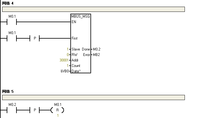 此程序编了有问题,用了二条MBUS_MSG命令,但条的使能位M0.1初始化后就被置位了,必须注意的是,一次只能激活一条MBUS_MSG 指令。如果启用了多