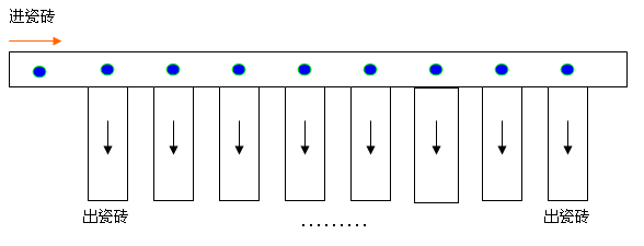 总共有八种类别的瓷砖需要分类,当瓷砖经过左边个光电的时候,操作员通过操作屏将此瓷砖的类别输入plc系统,比如属于类就输入1,以此类推。8个出砖工位分别对应8个瓷砖类别,各有一个光电确定瓷砖到了该工位,当属于这一工位类别时利用气缸将瓷砖推入出瓷砖机构进行出砖,反之瓷砖继续在瓷砖上输送,如果出砖机构还没结束本次出砖动作的时候,属于本类的瓷砖已经到达光电位置,则放弃此瓷砖,让皮带将其输送到系统做右方,即放弃分拣此瓷砖。同时,用户可以将几个工位设置成一个种类。