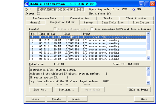 cpu315-2dp的plc带了几个et200站,现在有一个分站18报故障。distributedi/os:stationreturn。但是在线监视硬件组态时,这个分站显示通讯正常,并未打叉,而是cpu显示打叉状态。cpu并未停机。诊断信息为: