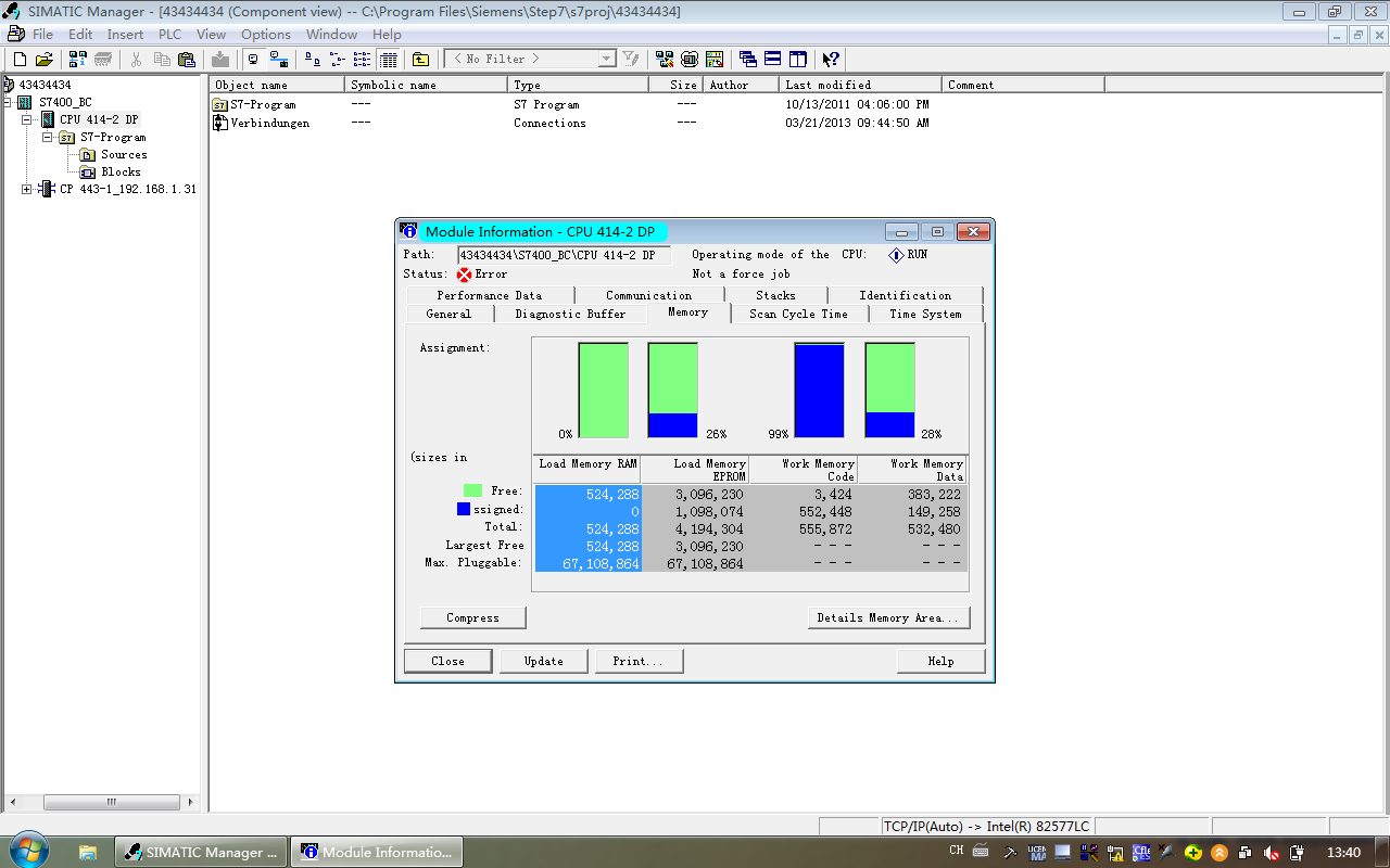 内存信息查看执行菜单plc/diagnosticsetting/moduleinformation(plc/诊断/设置/模块信息),打开模块信息窗口,选定“memory”(存储器)选项,可以看到cpu的工作存储器和装载存储器当前使用的情况,装载内存(loadmemoryram)是否有足够的空间来存储新的快,可以点击“compress”(压缩)按钮,以便释放更多存储空间。
